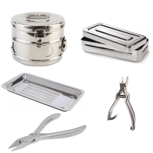 COMBO PODOLOGICO: Bandeja + Caja Chica + Algodonero 10×10 + Alicate Recto + Alicate Curvo