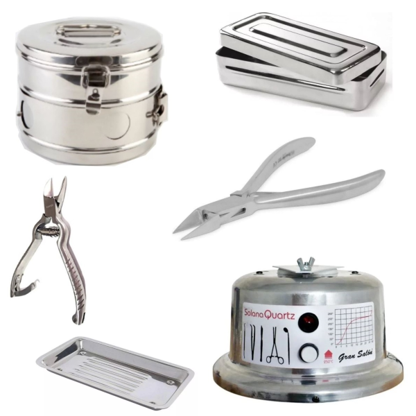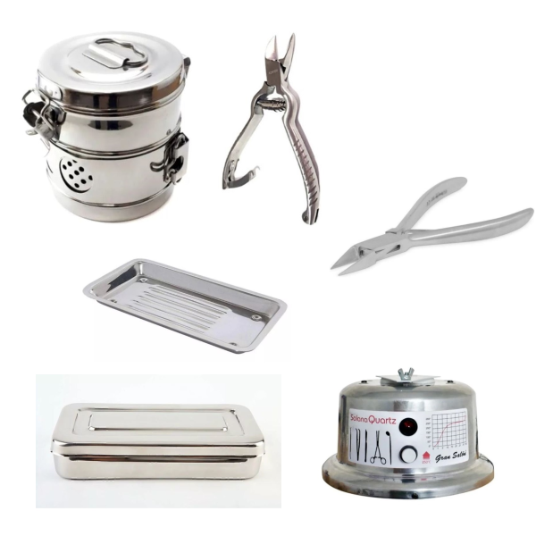 COMBO PODOLOGICO PROFESIONAL: Bandeja + Caja Chica + Algodonero 10×10 + Alicate Recto + Alicate Curvo + Esterilizador de Cuarzo