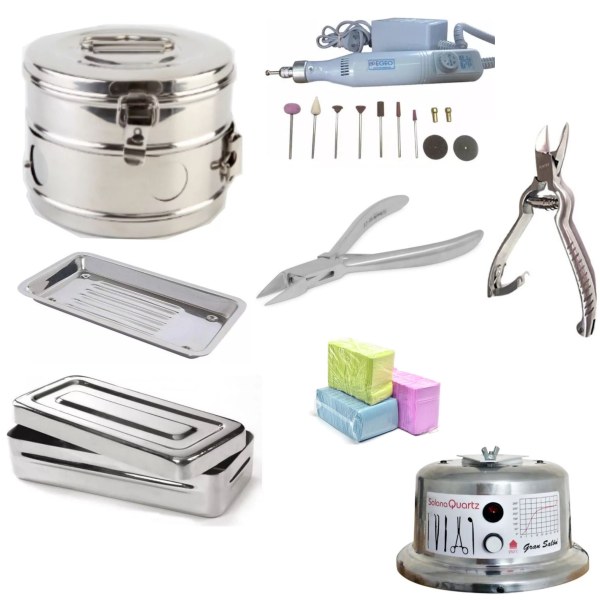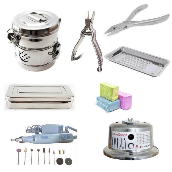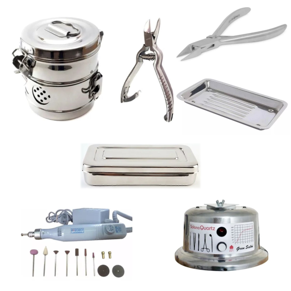COMBO PODOLOGICO PROFESIONAL: Bandeja + Caja Chica + Algodonero 10×10 + Alicate Recto + Alicate Curvo + Esterilizador de Cuarzo + Torno Egeo