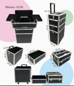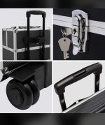 El maletin se compone de 3 niveles con revestimineto de terciopelo, que se pueden convinar entre si. La zona superior se puede utilizar comomaletin de mano de manera independiente. Un compartimiento extraible en el ultimo nivel puede dividirse como se desee gracias a que cuenta con tabiques moviles. Todos los niveles pueden cerrarse por separado. El asa telescopica de este maletin se puede ajustar perfectamente a las diferentes alturas disponibles. Cuenta con unas ruedas de funcionamiento muy suave ademas de esquinas reforzadas en metal para garantizar la maxima movilidad y eguridad a este maletin de la belleza. Practico, ligero y elegante.
