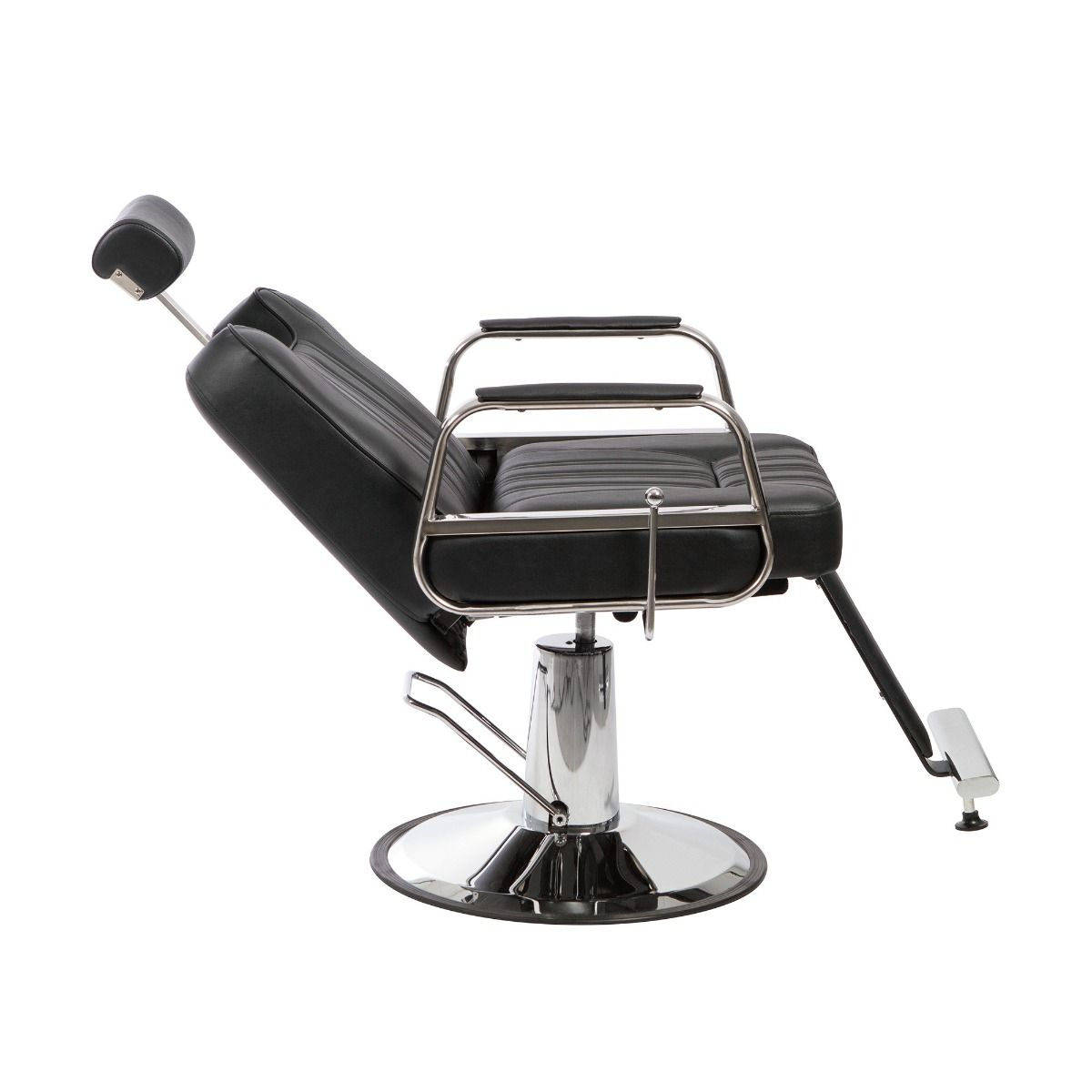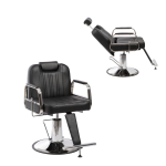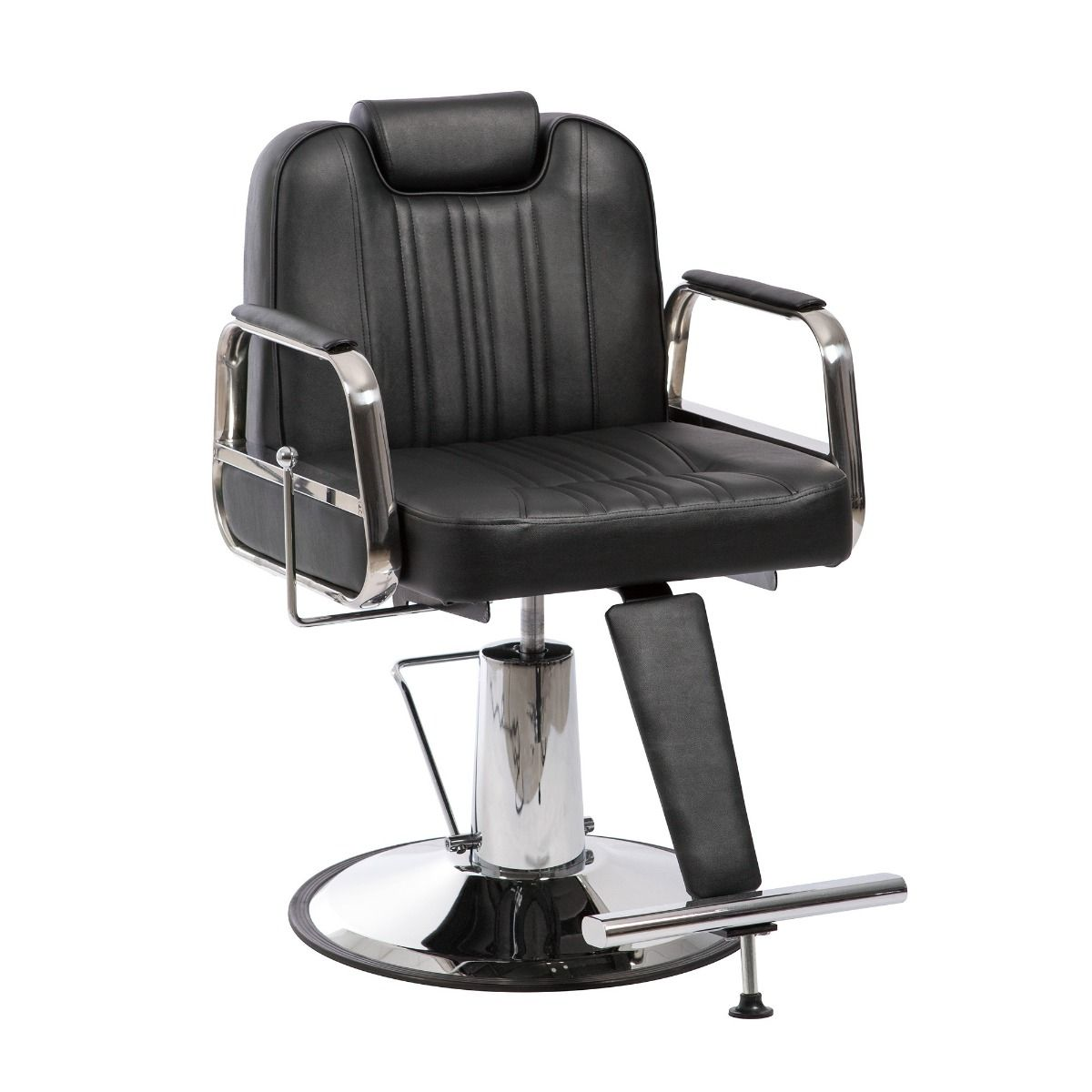Se trata de un moderno y funcional Sillón hidráulico con respaldo reclinable, que dispone de una resistente bomba hidráulica para regulación de altura, así como una elegante base con un práctico reposapies metálico integrado. El sillón también dispone de reposacabezas extensible hasta 20 cm, además de un tapizado en polipiel de alta calidad en color negro con acolchado de gran confort y elegantes acabados. Algunas de las características generales más importantes del Sillón hidráulico, que lo hacen ideal para su uso en peluquería o barbería, son las siguientes: